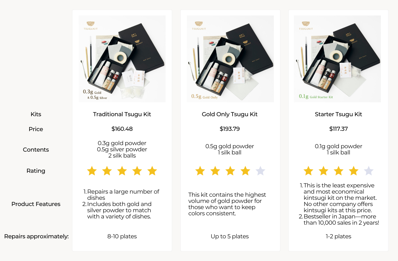 This kit has the most pure gold of all three Tsugu Kits. It costs more, but is more economical than buying extra gold later—since gold powder runs out the fastest.