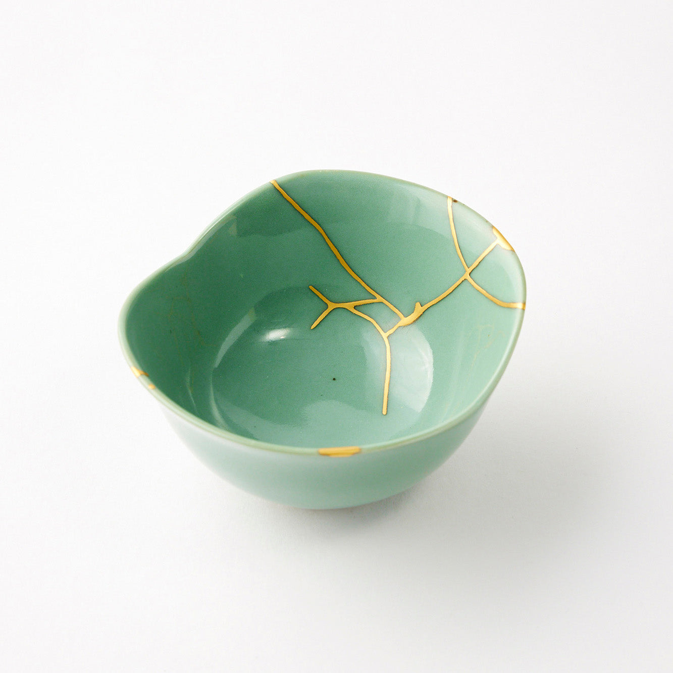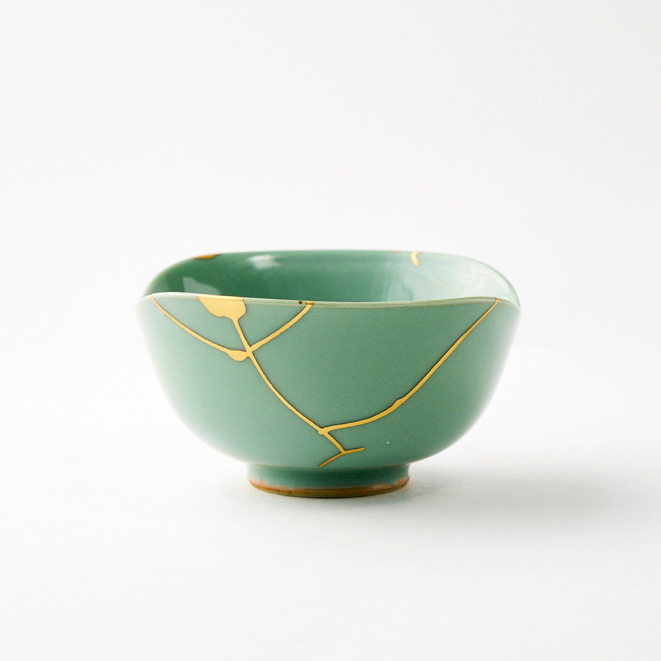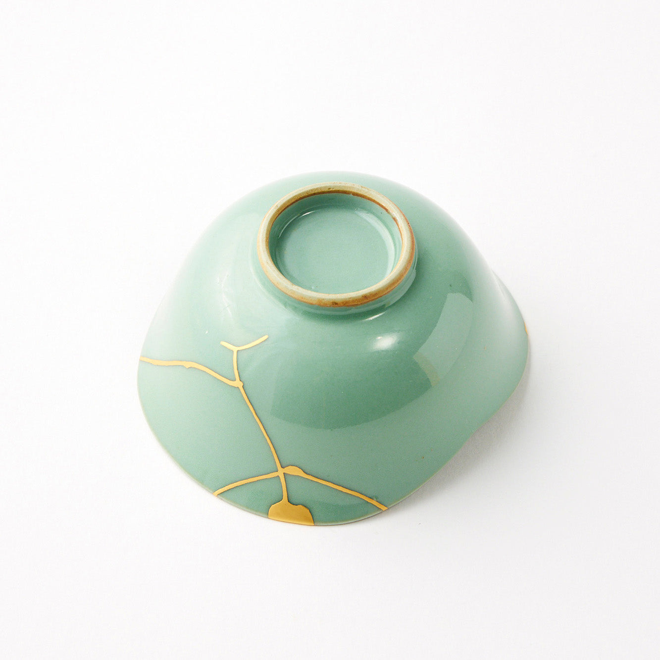 A small bowl once broken into four pieces, now blooms again in soft verdigris green. Delicate lines of matte gold powder trace the cracks, quietly revealing the heart that emerged through its mending.
