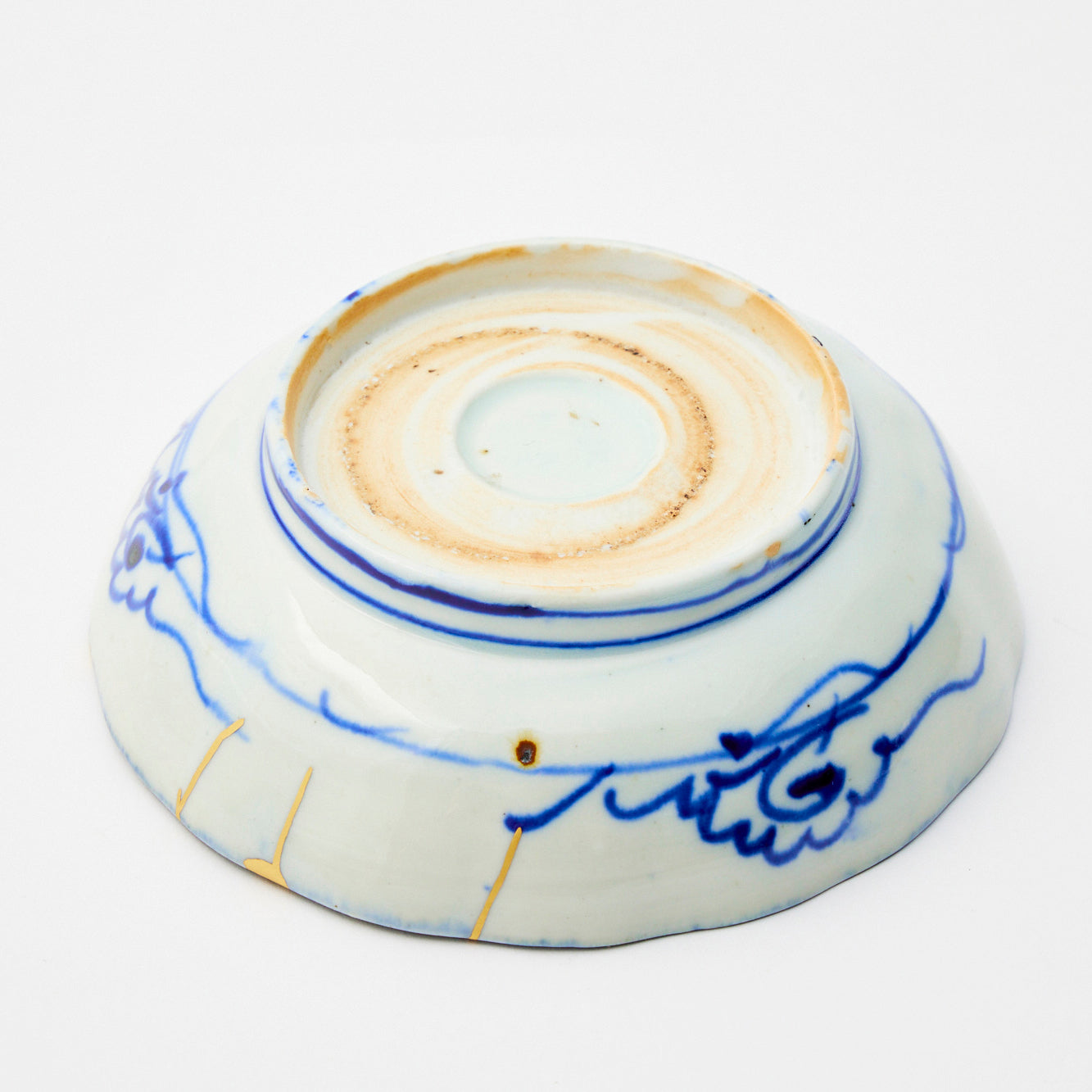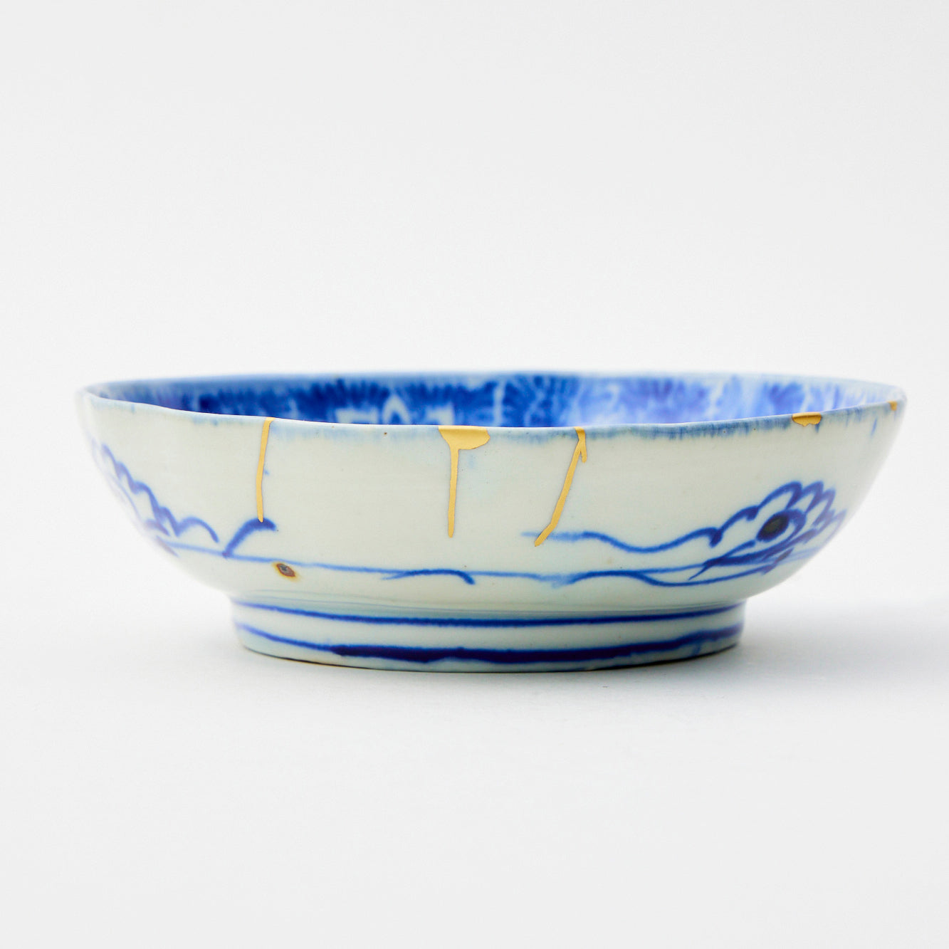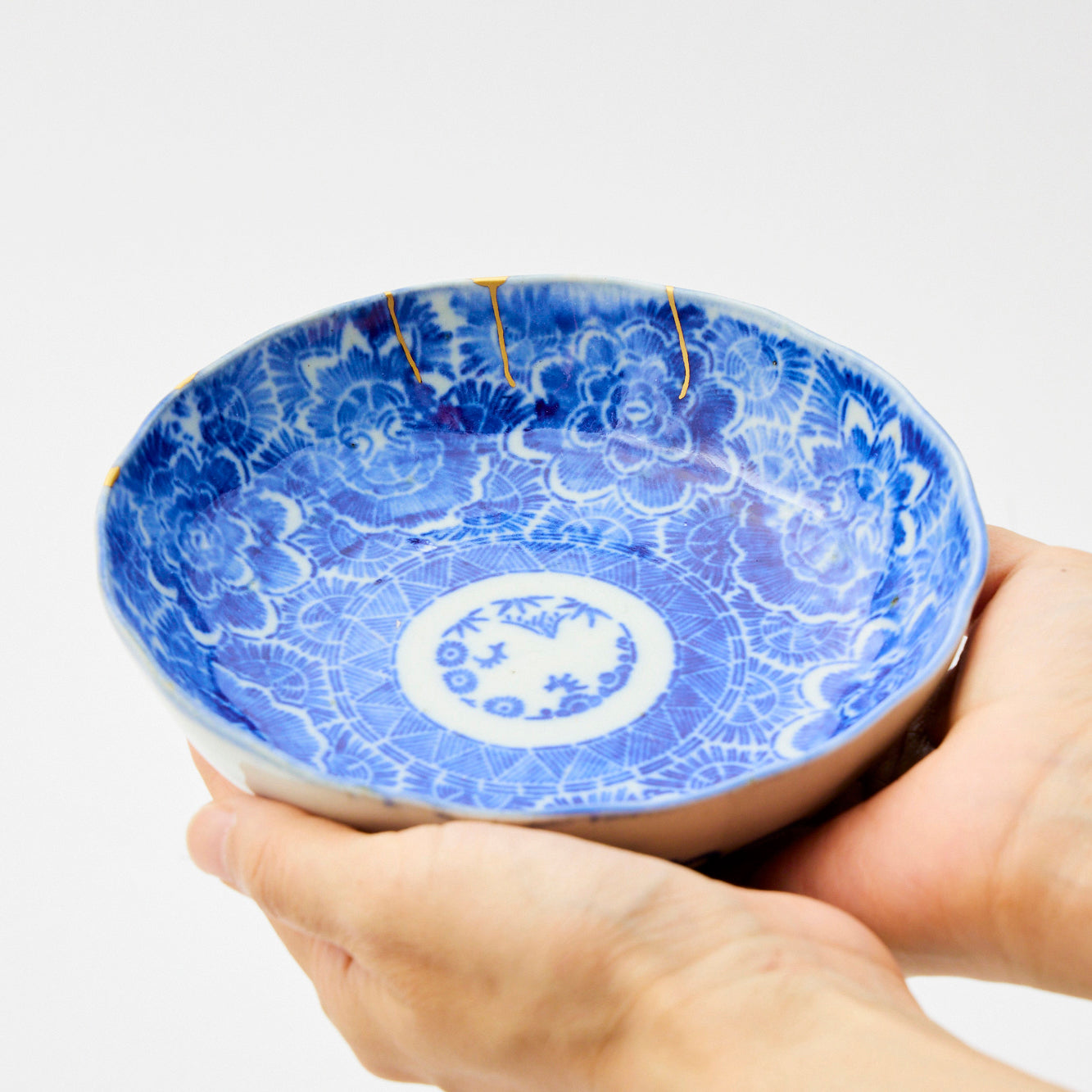 A shallow Meiji-era dish featuring indigo-blue paper-print peonies arranged in a kaleidoscopic pattern on white porcelain, accented by gold kintsugi repairs.