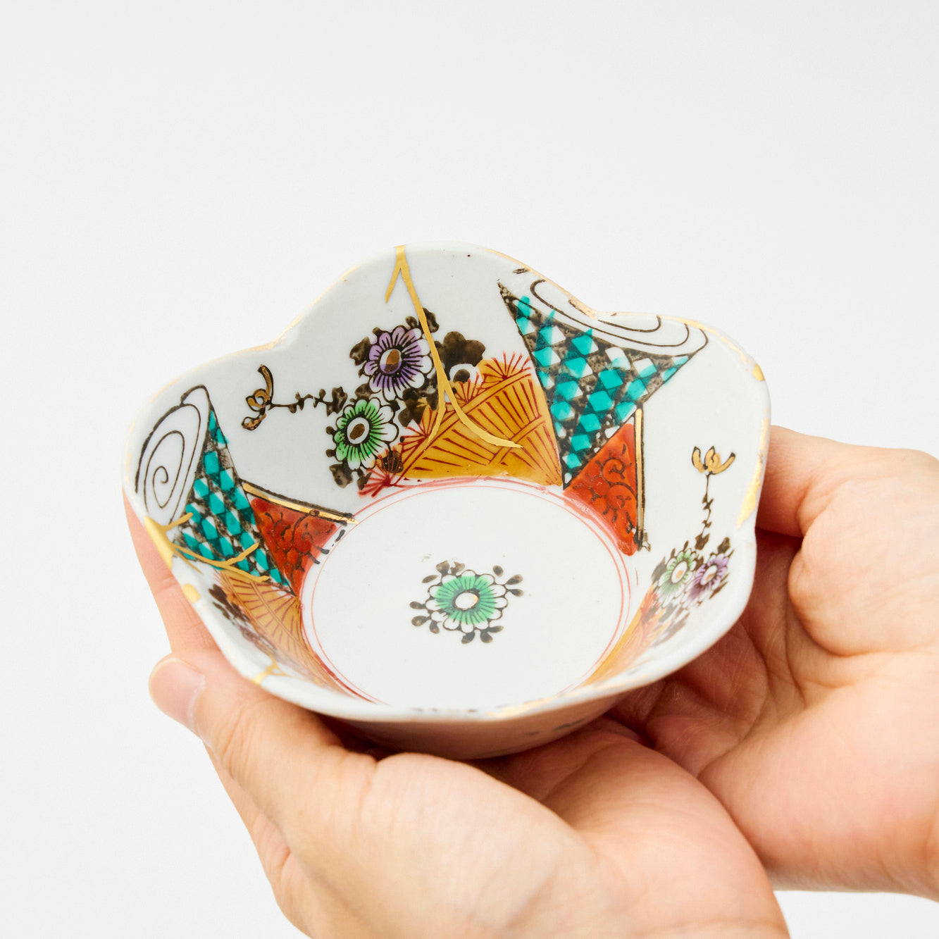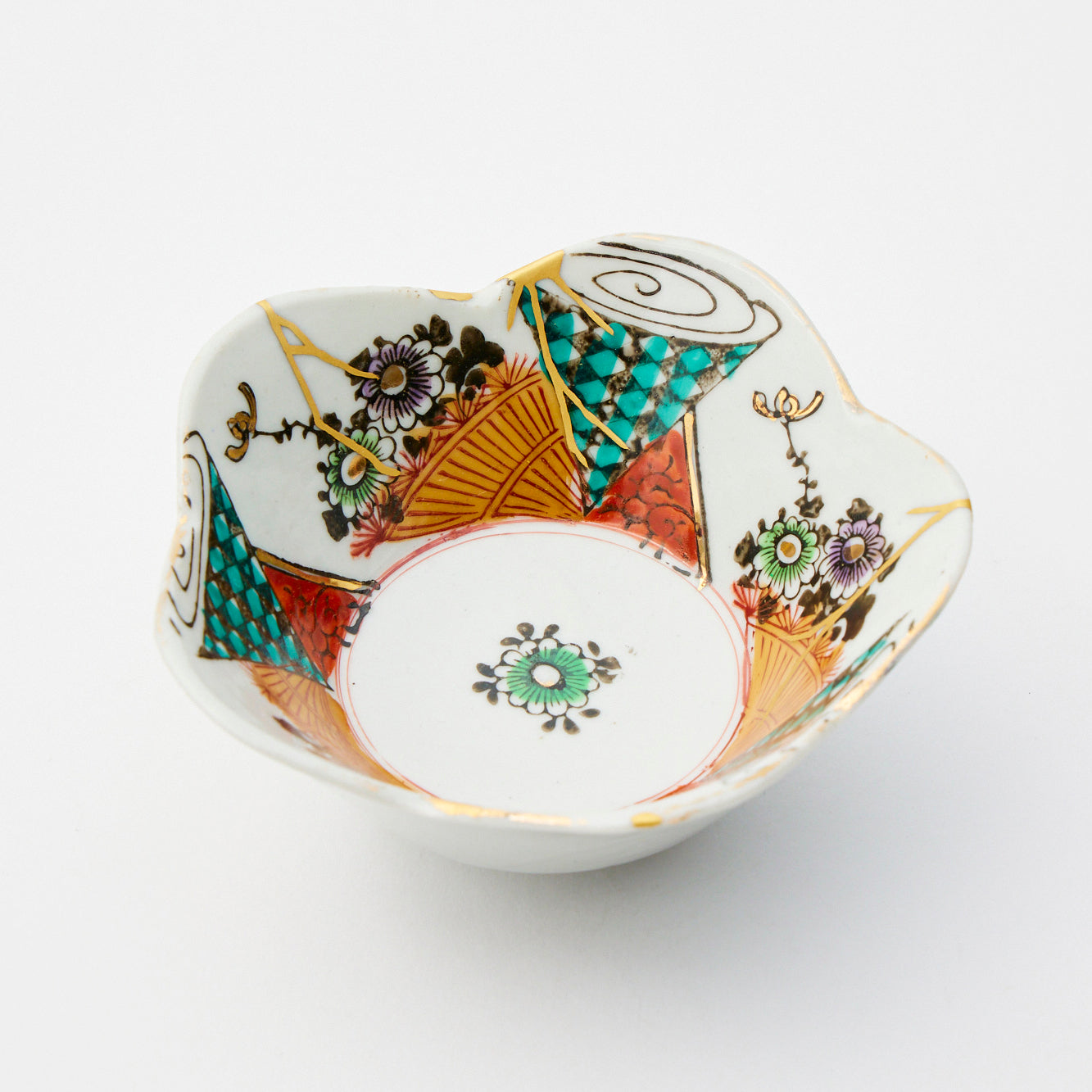 A flower-shaped shallow porcelain bowl adorned with colorful auspicious motifs celebrating abundance, its delicate gold accents subtly gleaming. Expertly repaired with radiant kintsugi seams that cradle every crack and chip, this piece elevates imperfections into wabi-sabi art.