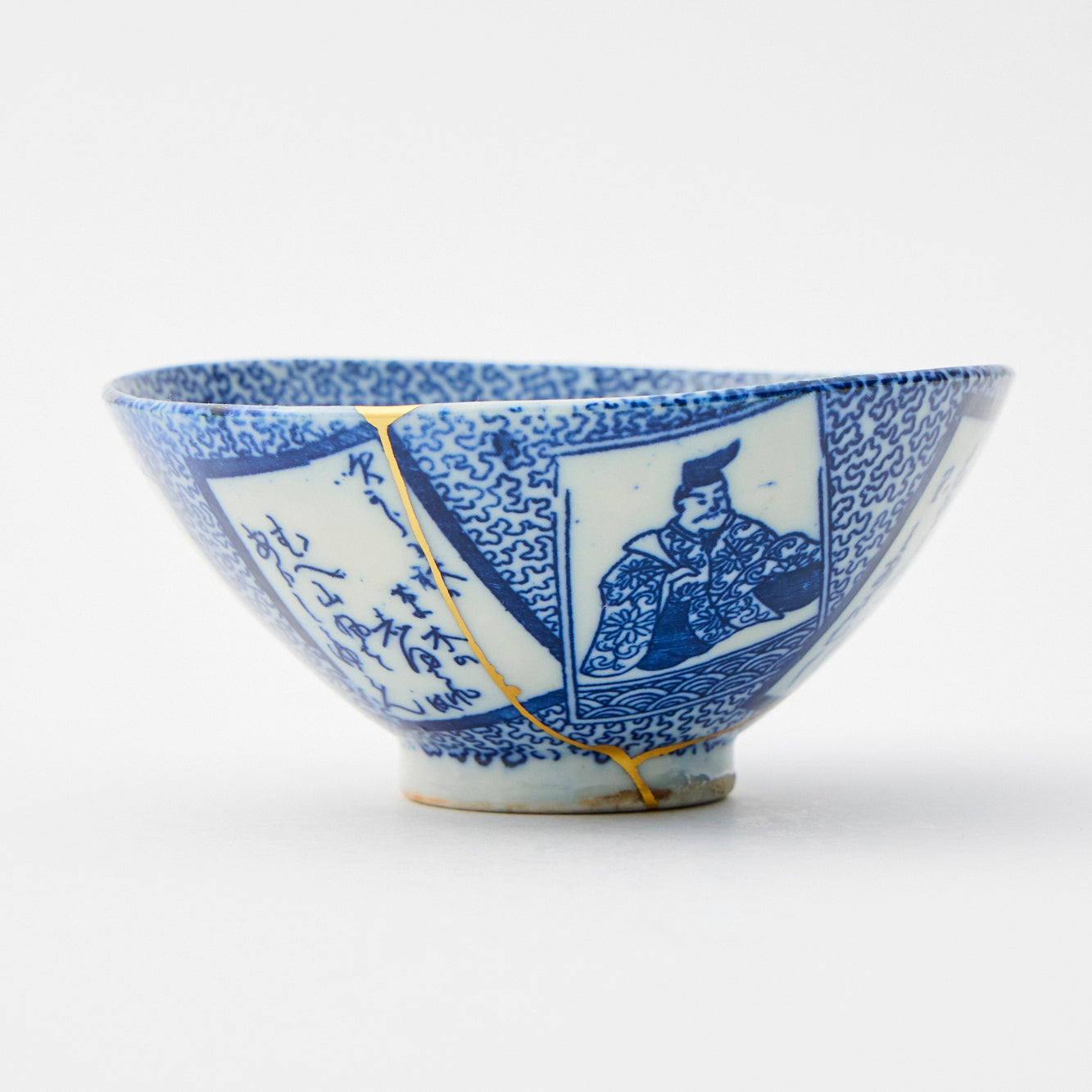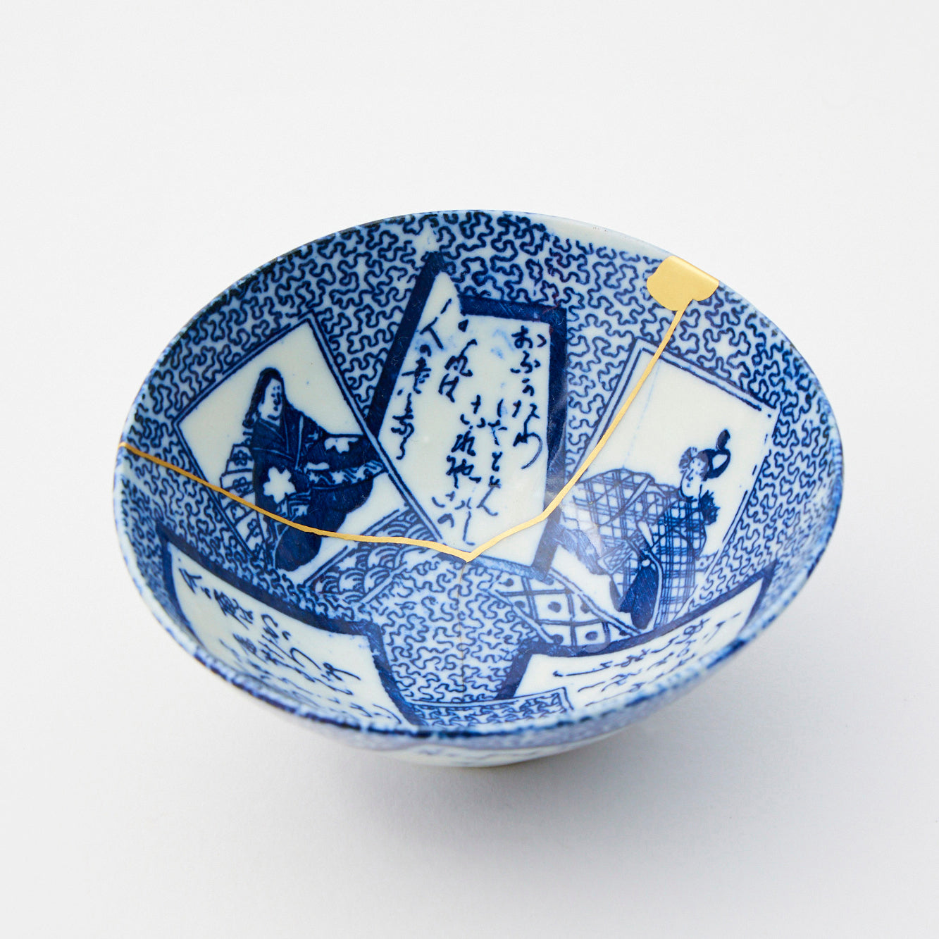 KINTSUGI Golden Verse: Blue Hyakunin-Isshu Tea Bowl|Food Safe