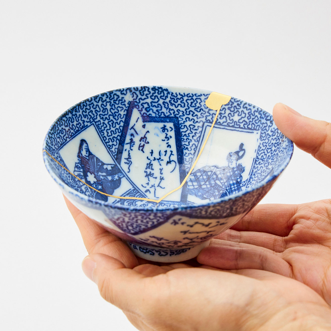 This petite printed rice bowl lets its gold kintsugi quietly “chant” the stories told by the calligraphy and illustrations of the Hyakunin Isshu*. In its deep blue glaze, a soft glow of gold gently nestles alongside.