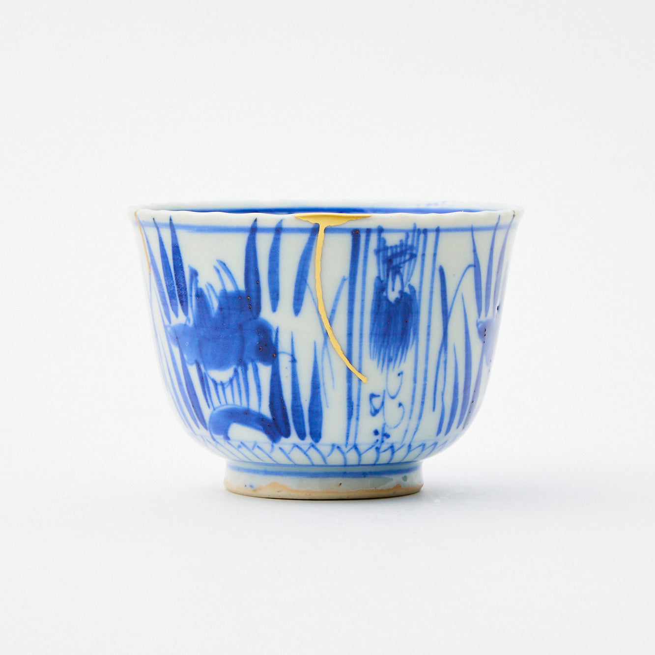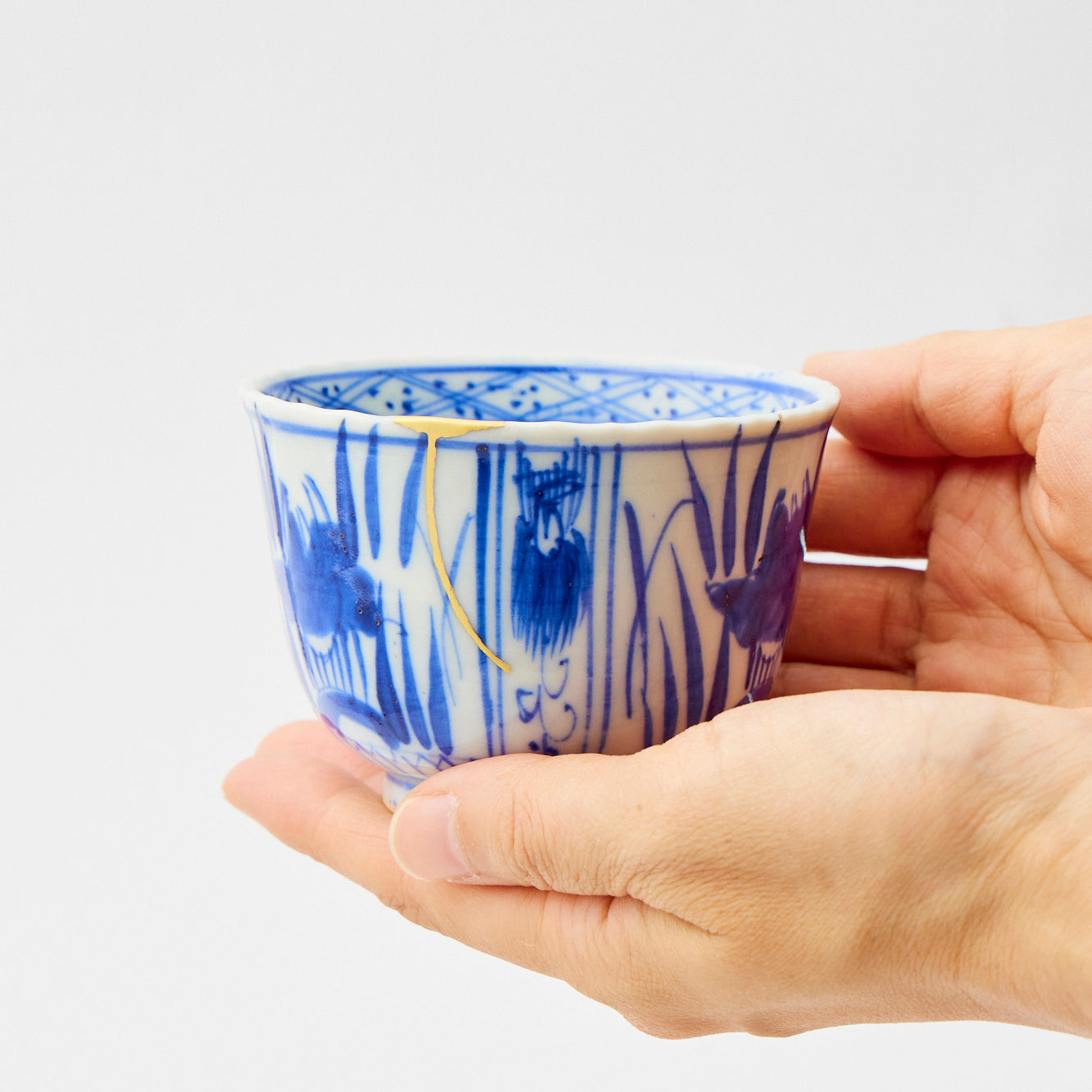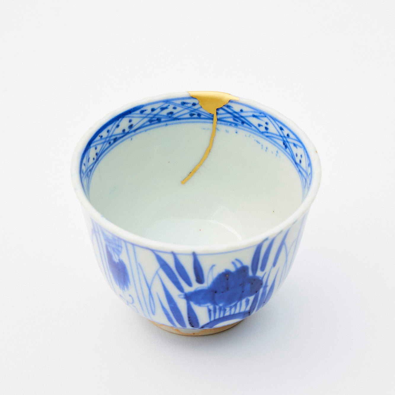 A small white porcelain teacup painted with lapis-blue blossoms, repaired with golden veins that elevate past cracks into art.