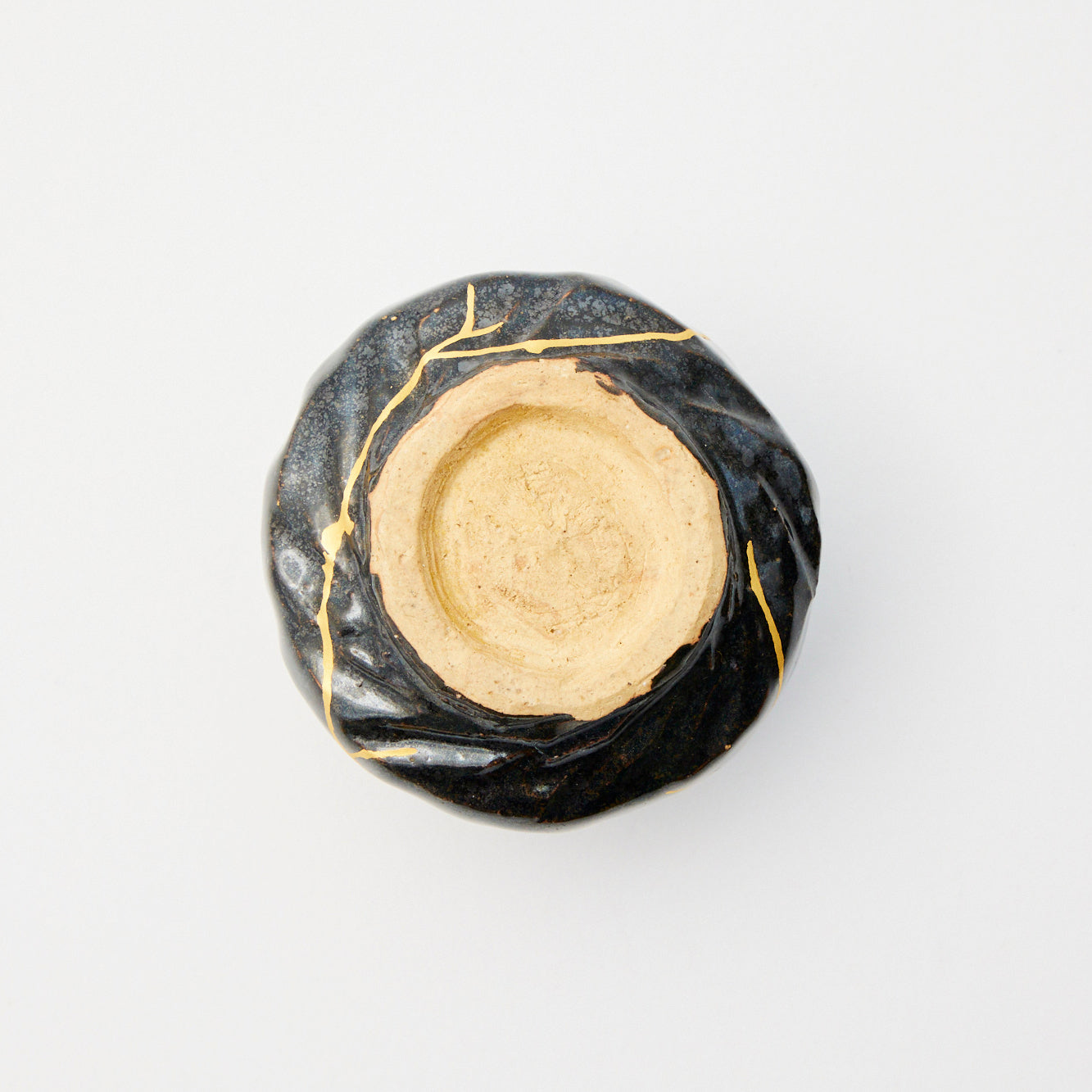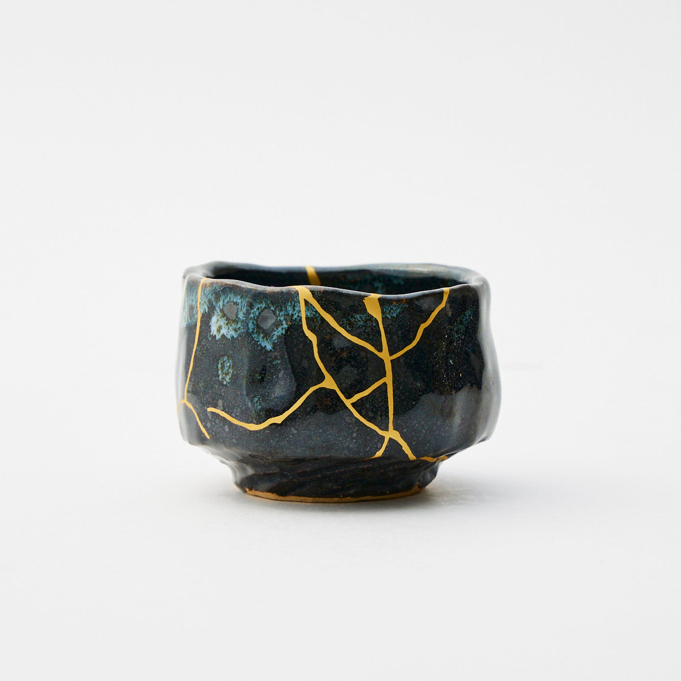 Shattered into six fragments, this ebony cup was meticulously reassembled with golden kintsugi seams that flash like lightning. Savor sake and embrace the beauty born from its dramatic restoration.