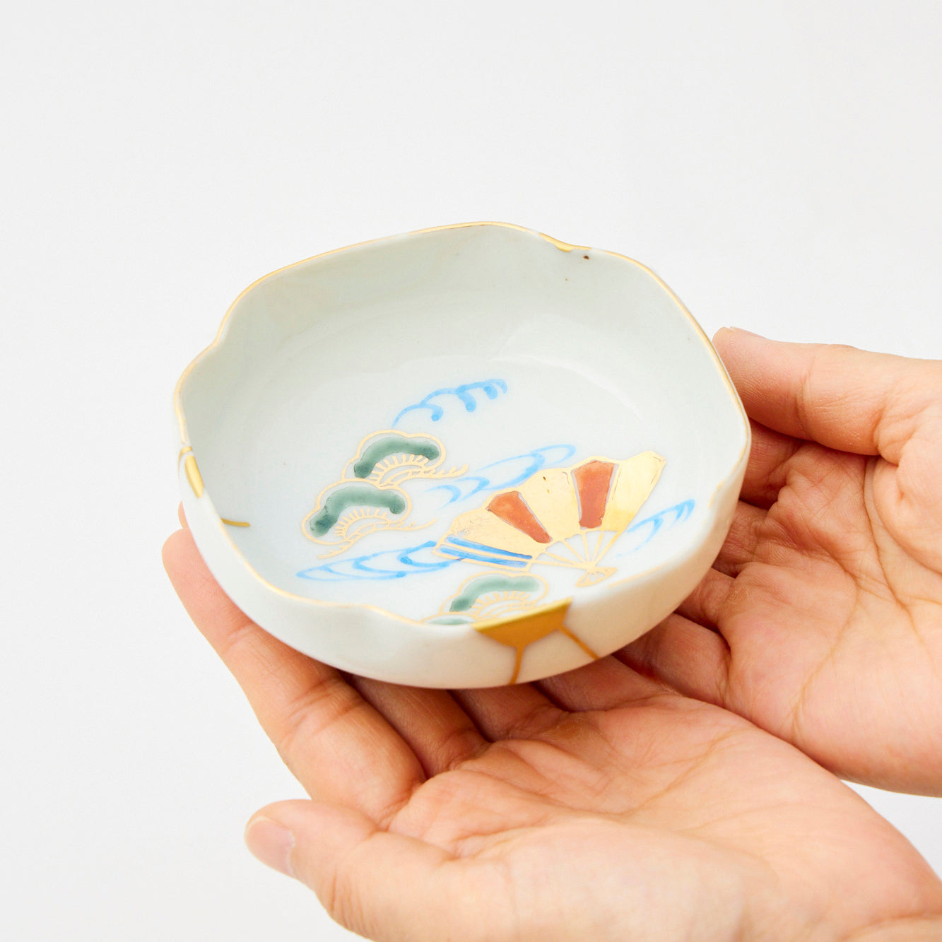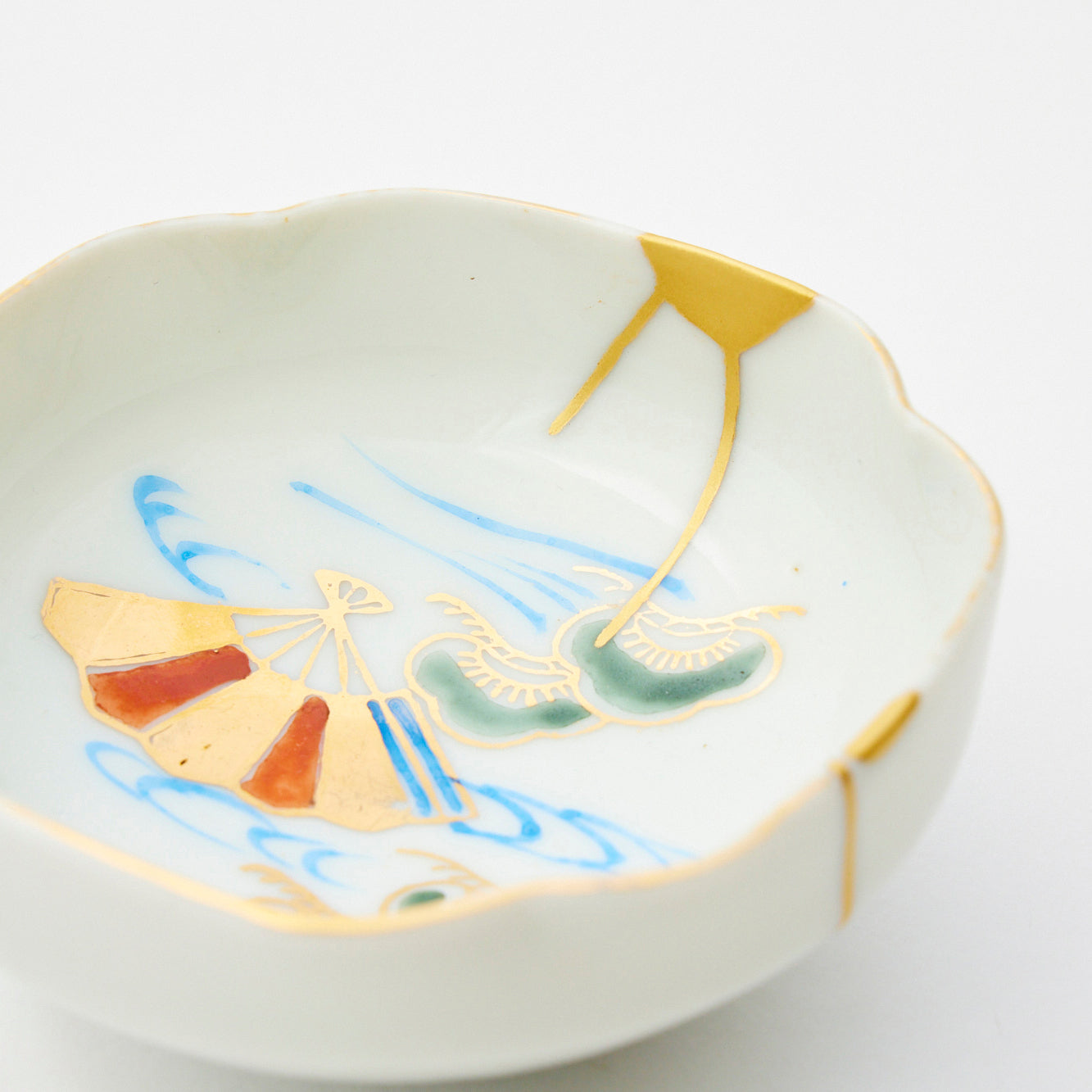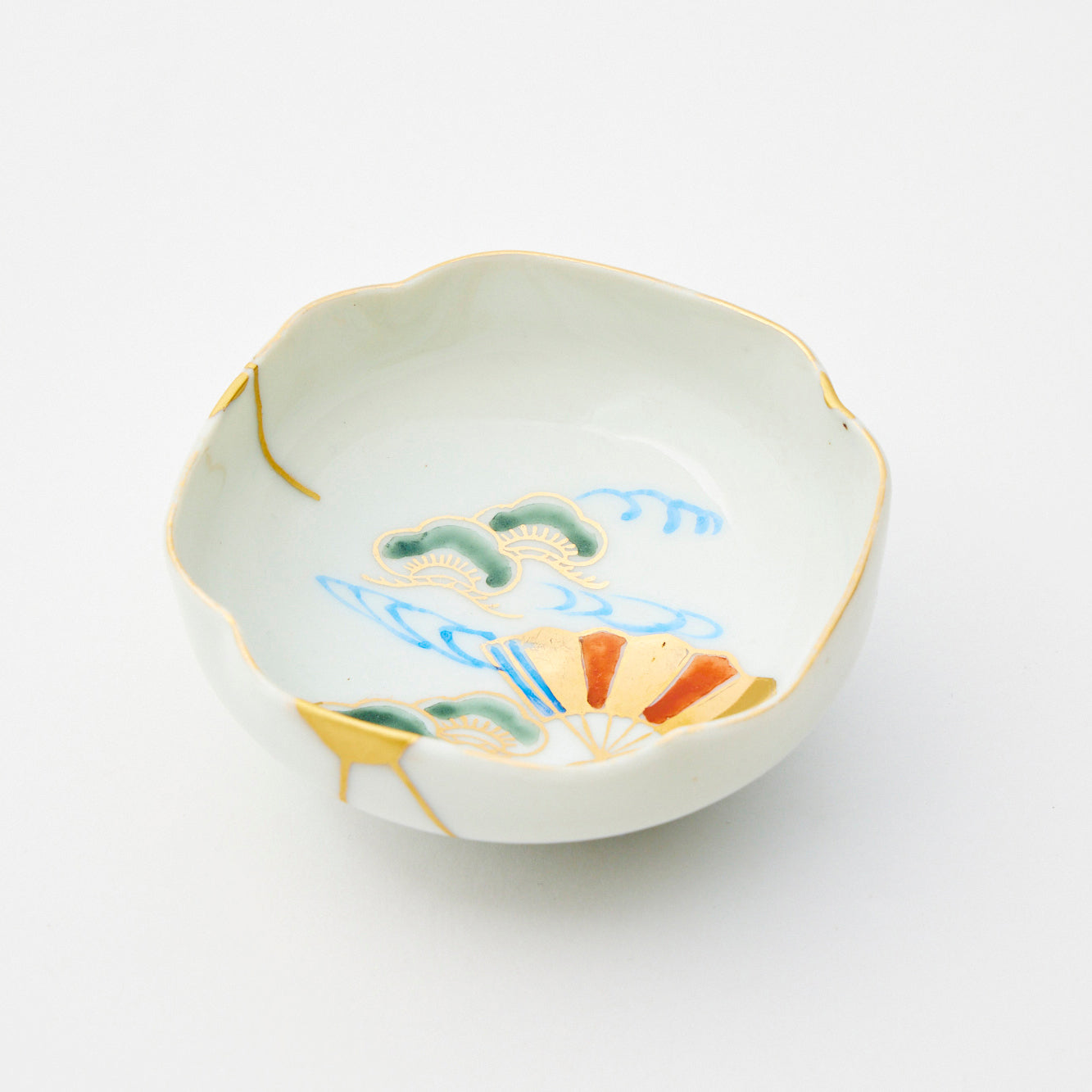 An exquisite small porcelain dish showcasing a traditional pine-and-sensu (folding fan) motif—symbols of longevity and auspicious fortune. Expertly repaired with kintsugi, the golden seams harmonize with the scenic design, elevating imperfections into celebrated wabi-sabi beauty.